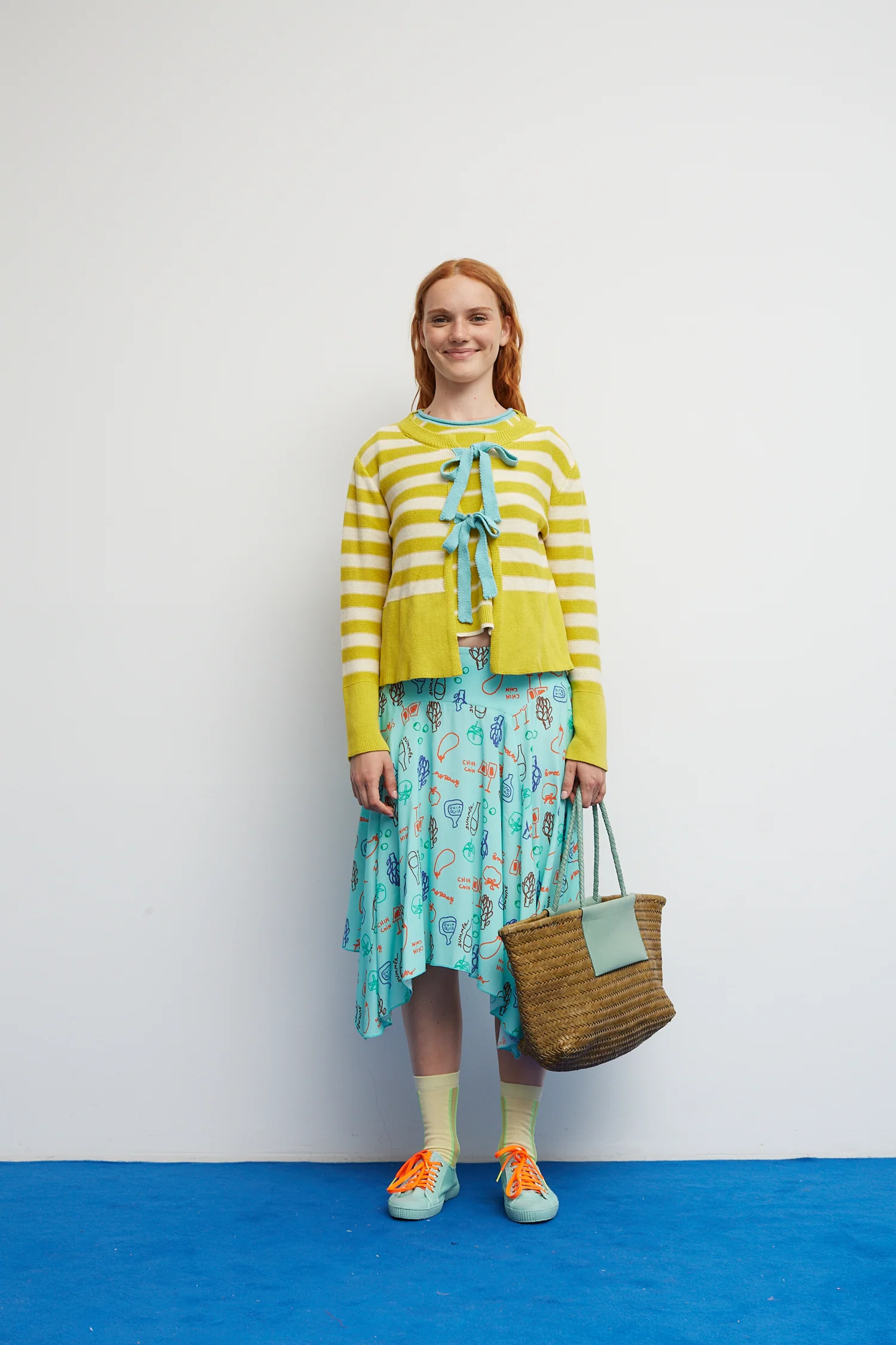 Una chaqueta de punto que combina romanticismo y color de la manera más Bloom. El diseño a rayas en amarillo y crudo aporta un aire fresco, mientras que los lazos frontales en tono verde agua vibrante añaden un toque bloom lleno de personalidad.