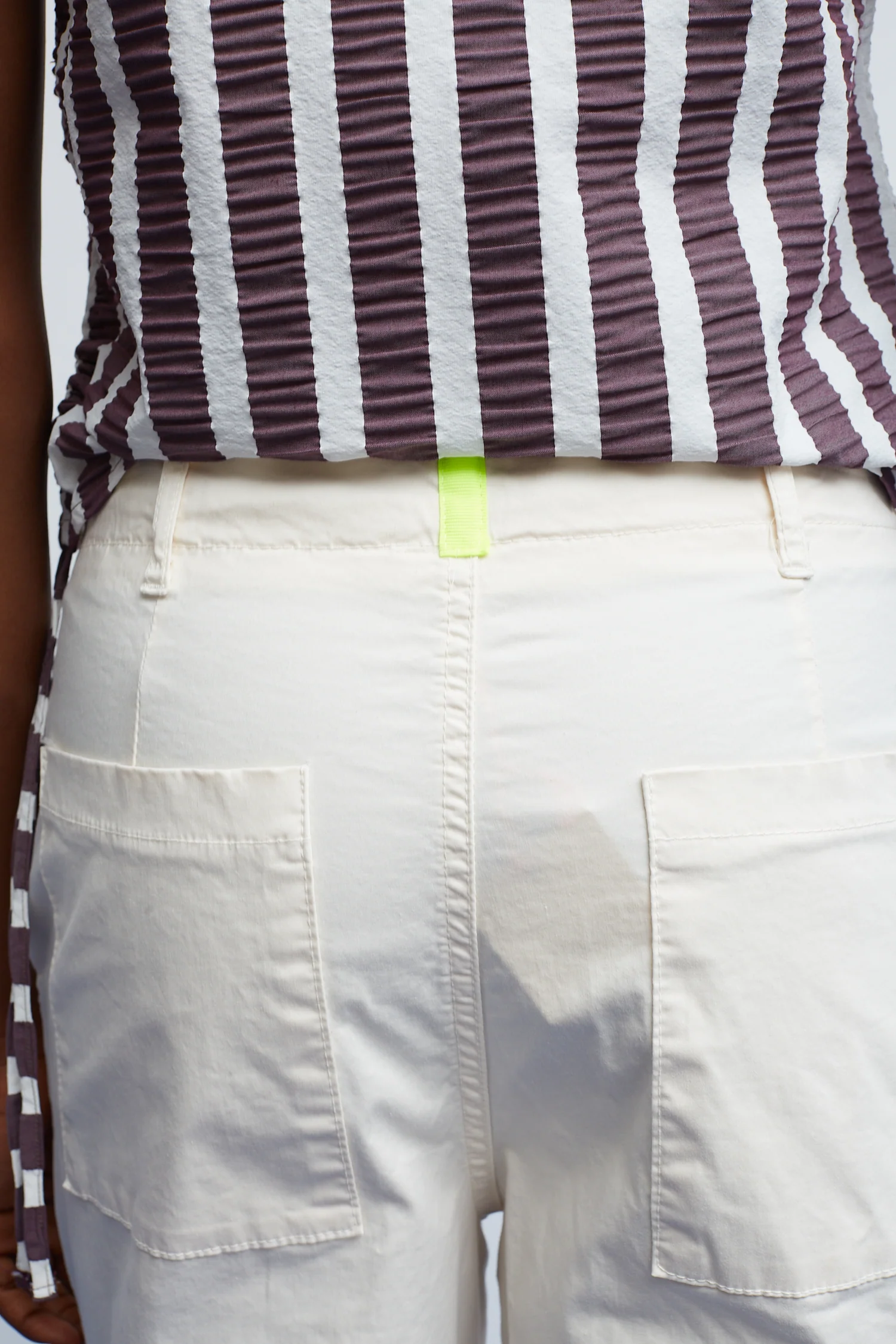 Un pantalón elegante, sencillo y muy combinable para aportar suavidad y equilibrio a los looks de verano. Su diseño en crudo crea una sensación delicada y luminosa, mientras que el corte recto aporta estructura sin perder ligereza. El bajo con vuelta añade un acabado moderno. Es una prenda fácil de llevar durante todo el día. La cintura estructurada con cierre frontal refuerza su carácter versátil, ideal tanto para combinaciones relajadas como para looks más arreglados.